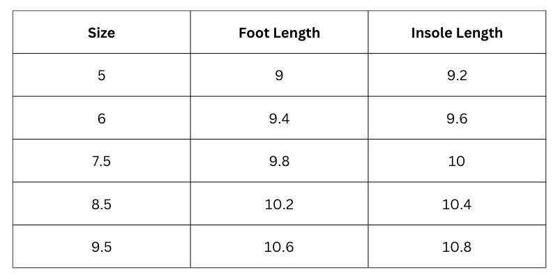 Size Chart (inches):